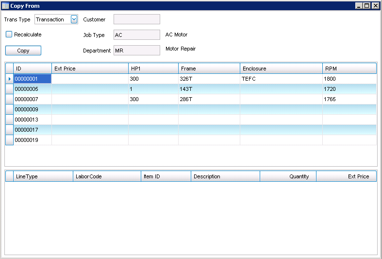 - If Historical Transaction is selected, the top grid will show jobs that have been posted to history that you can copy from.