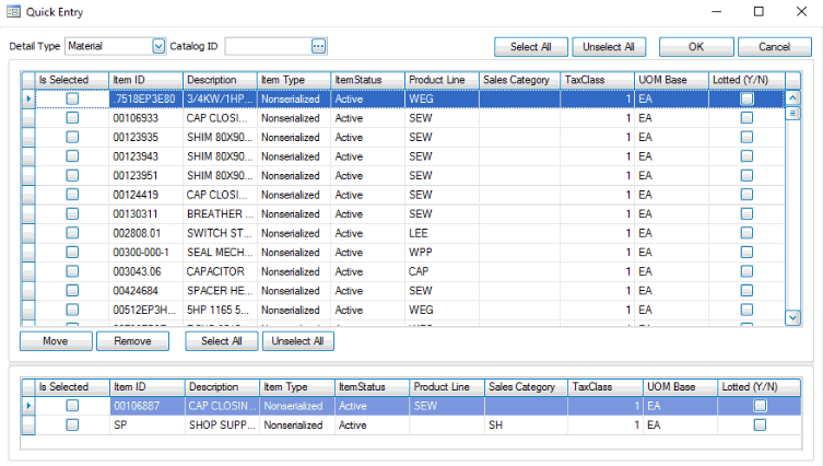 - If you wish to remove chosen items from the lower grid, mark the selection check box in the lower grid to select those items, then use the Remove button to remove them from the item list. Use the Select All button to mark all the check boxes, or use the Unselect All button to clear all the check boxes.
