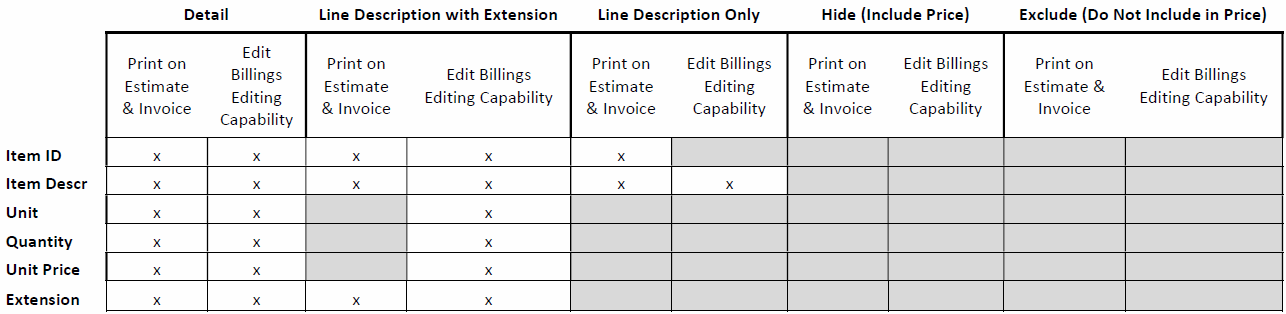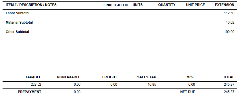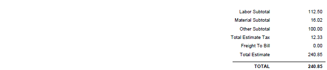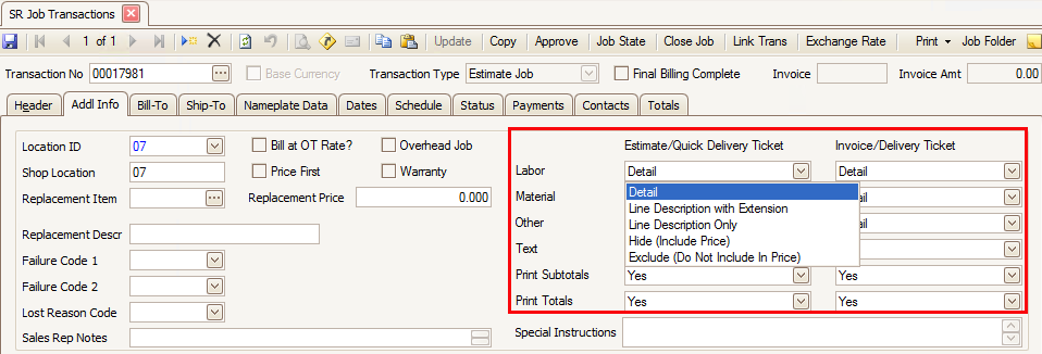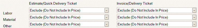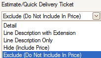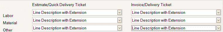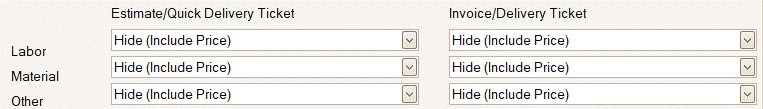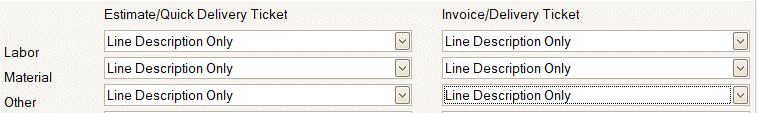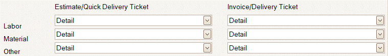 You can select to print Subtotals and/or Totals, as well as the level of line item detail, on Estimate/Quick Delivery Tickets and Invoice/Delivery Tickets. You can define these options in each Department, and also change them per job transaction.