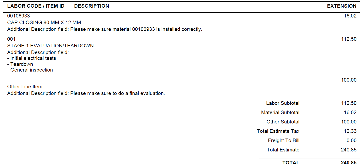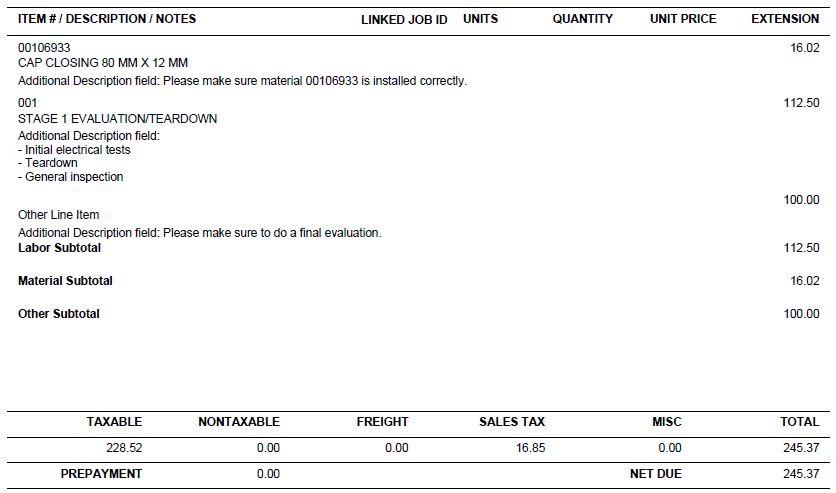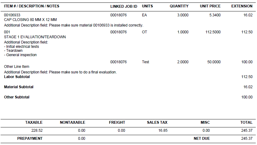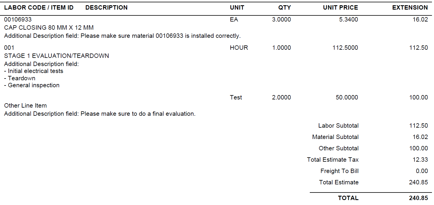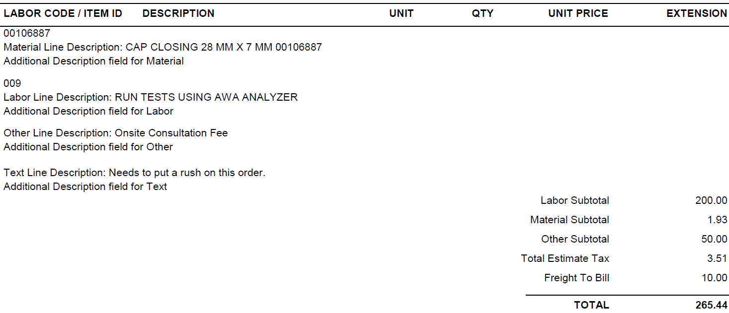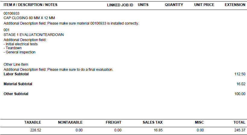 The following are options for Labor, Material, and Other along with examples of what will print on the form.