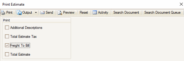 If you check the box, the message "Estimate includes Freight if applicable" will print at the bottom of the estimate; otherwise, the message "Estimate does not include Freight if applicable" will print.