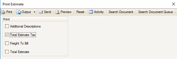 If you check the box, the tax amount will print along with the message "Estimate includes Sales Tax if applicable"; otherwise, the message "Estimate does not include Sales Tax if applicable" will print.