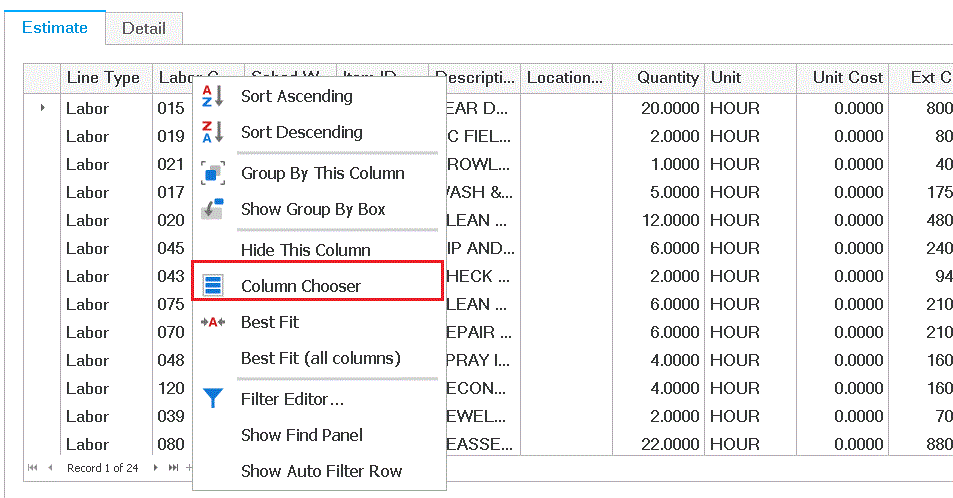 Right click on any of the column on the Estimate tab and click on Column Chooser.