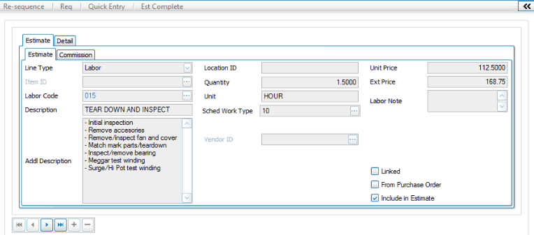 - In the Description field, if the line type is Material, the Item description will appear. If the line type is Labor, the description for the Labor Code will appear. If the line type is Text or Other, the description entered on the Estimate tab appears.