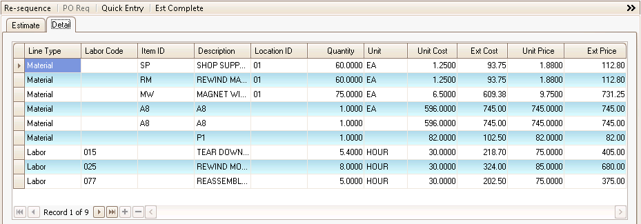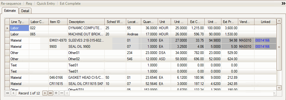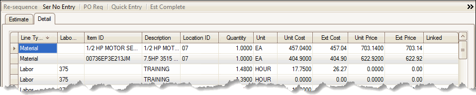 Enter line items for the job on the Estimate tab. You can enter Labor items, Material items, Text items, Other--Labor Cost/Price line types. The estimate may be used for customer billing, but is not used for calculating job cost.