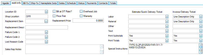 The Addl Info tab of the Job Transactions screen holds secondary information about the job.