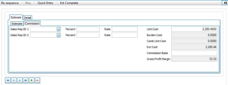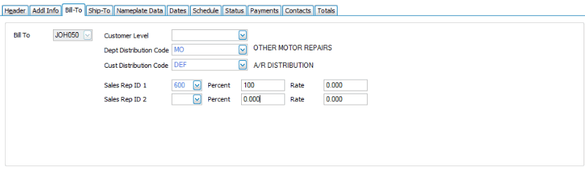 - The Sales Rep 1 (and Sales Rep 2, if available) for the selected customer will display in the associated Sales Rep ID field. You can select a different sales rep from the Sales Rep ID field drop-down list. The commission percent and rate appear in the Percent and Rate fields. Change the percent in the appropriate field if required. The total commission percent cannot exceed 100.