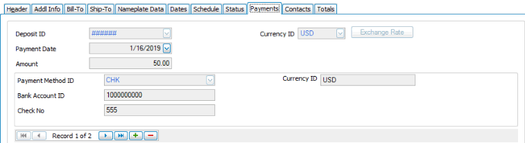| Payments | Review and/or enter external payment information for the customer. If the customer's Payment Method ID on the Defaults tab is set to an external payment processor, saved credit card information will appear in the External Payments screen for the customer. Note: You cannot add, edit, or delete external CC payment information in the detail grid. You must use the Payments button on the toolbar to open the External Payments screen to perform these actions. However, if you have an EMV (card reader) device available, you can use it to enter a new card when the Use New Card check box is marked. See the TPS Overview for more information about external payments, as well as some examples. |