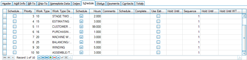- The Sched Work Type field allows you to assign a work type to one or more records. Only work types that appear on the Schedule tab will be valid for selection in the drop-down list.