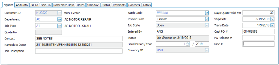 Enter primary information about the job transaction on the Header tab of the Job Transactions screen.