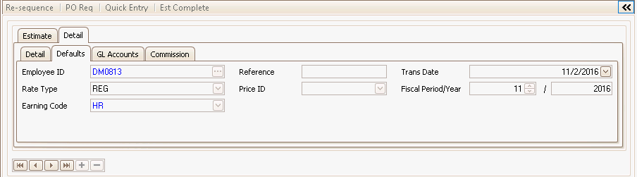 On the Labor types of lines for the job, the Defaults tab shows read-only employee information that comes from time card entry posts.