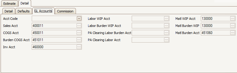 The GL Accounts tab displays the GL accounts from the posting of labor or material transactions to the job. The accounts come from the distribution code of the department to which the job is tied. These accounts will be used when posting after preparing billings and printing invoices. You can edit these accounts, if available, in the Edit Billings screen. Any changes will apply only to this transaction.