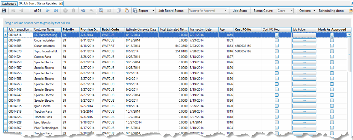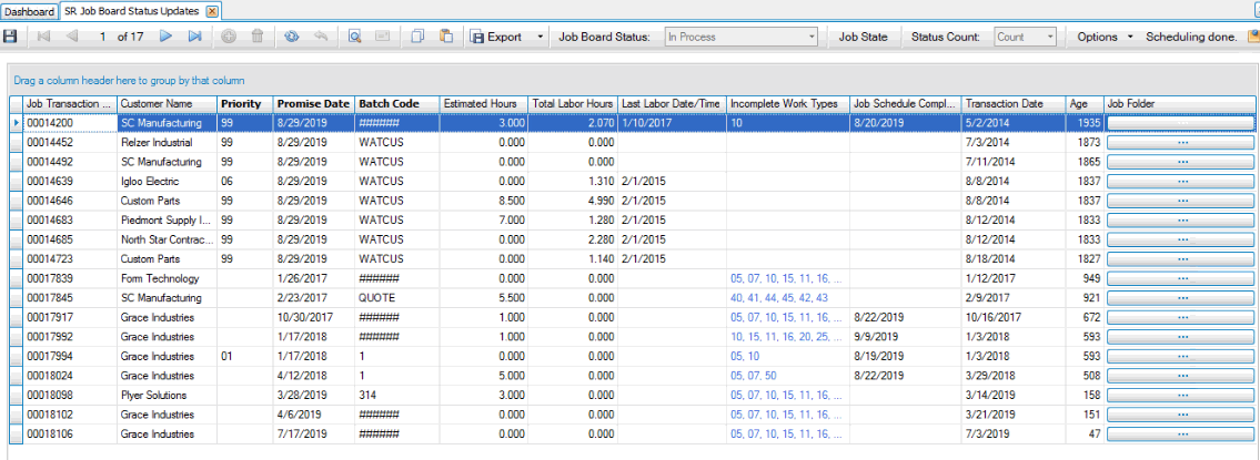 Once all the parts are received, the job will be 'In Process'.Job Complete All scheduled work types ('Schedule' check box is marked in Job Transactions function) have been completed. If work types are not used, the ship date is used instead.