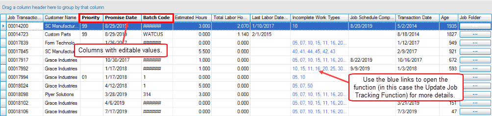 Use the Job Board Status Updates planning board to view open job transactions. The job board is similar to the Job Board Status dashboard in the information available. The Job Board Status Updates planning board allows you make changes to certain fields of the transaction by editing those fields.